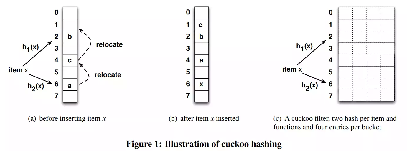 其中, 是指待插入的元素, 是指元素的指纹, 即为计算出来的两个哈希值。具体来讲,第一个桶的索引是通过某个哈希函数计算出来,第二个是使用第一个索引和 指纹的哈希 做了一个异或操作,由于异或运算的特性,所以我们可以通过当前桶的索引 和存储在桶中的指纹 计算出备用桶的索引 。 计算指纹 的哈希这一步是不是冗余的呢?并不是。因为指纹只是 key 映射出来的少量bit位置,假如不进行哈希操作,那么计算出来的备用位置和 差别很小,例如采用8位的指纹时,如果直接计算 ,那么最多改变 的低八位,也就是在数值上最多相差256,不利于均匀分配。