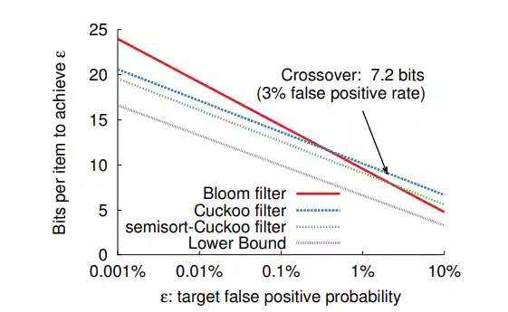 上图是布隆过滤器、布谷鸟过滤器和其他过滤器在误判率和元素空间成本上的比较。由图可知,布谷鸟过滤器在空间成本上比布隆过滤器更加出色,存储空间会更小。